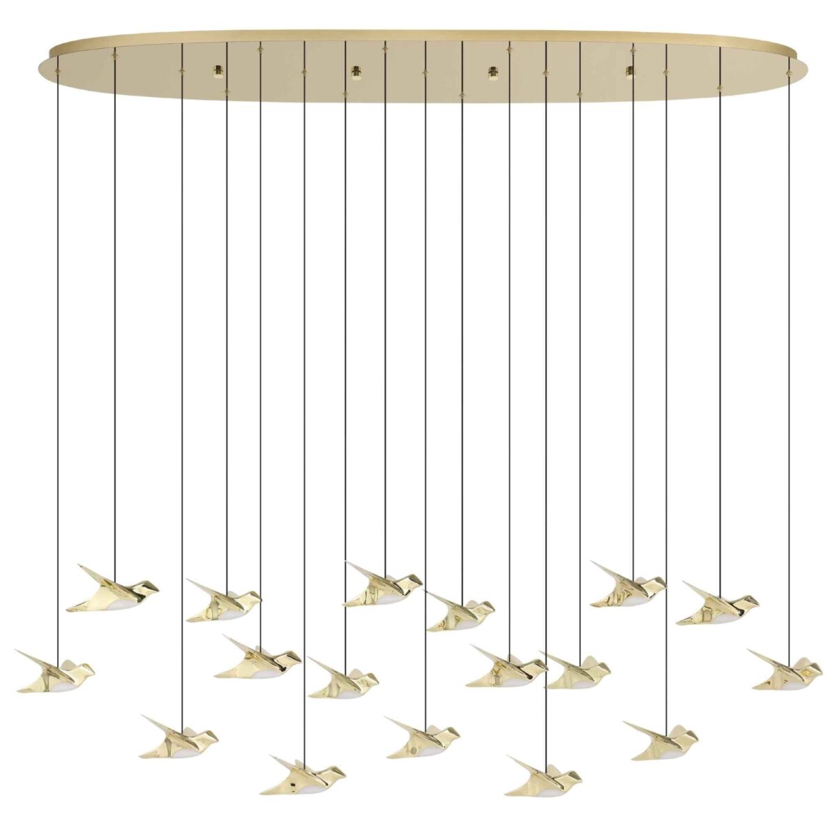 Design artistic, cu 17 pendule ce sugerează păsări în zbor.