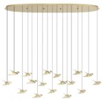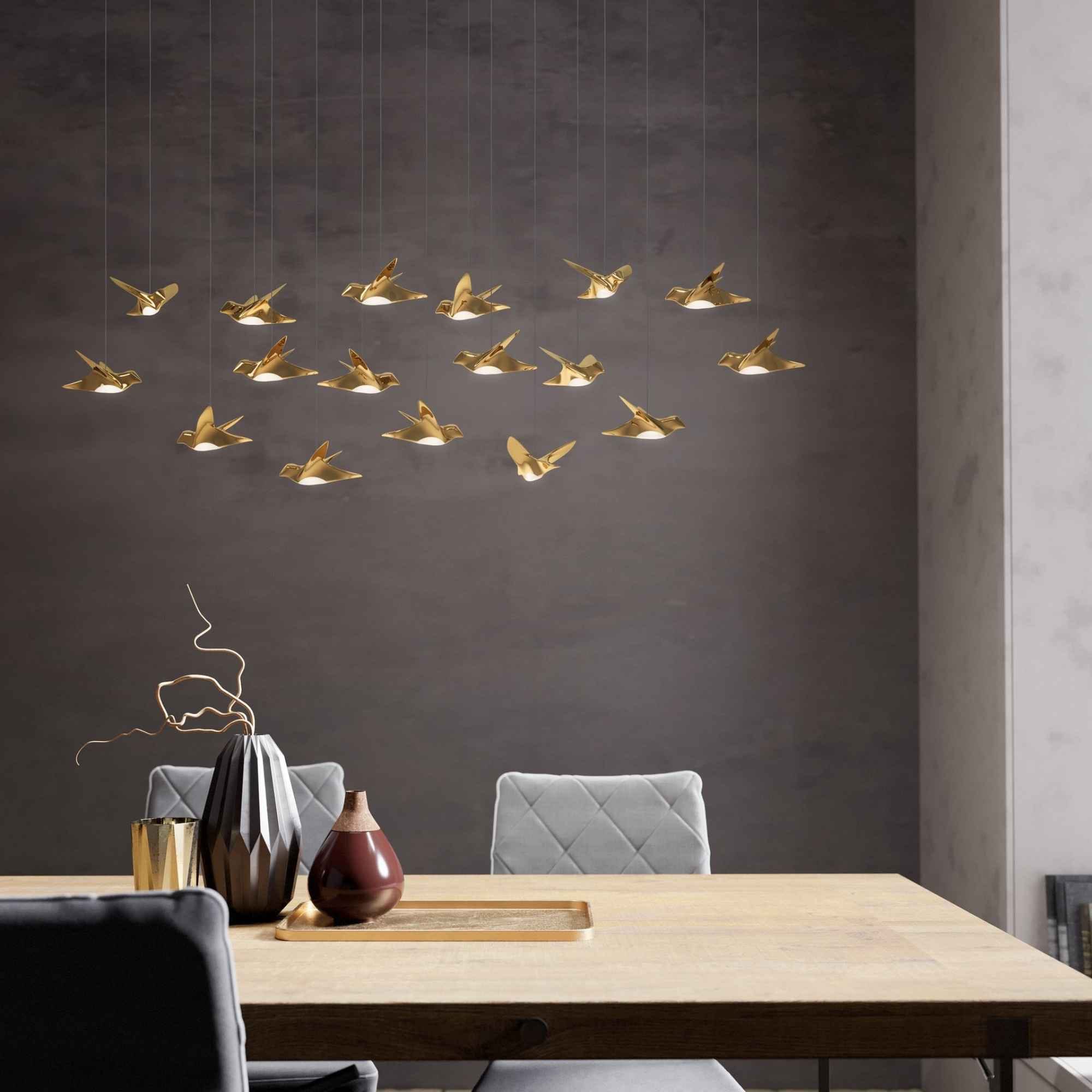 Lustra LED Paratebueno 2 Eglo este un corp de iluminat premium ce atrage privirile prin designul spectaculos al celor 17 pendule aurii, inspirate din zborul păsărilor. Această lustră aurie cu lumină caldă combină eleganța finisajelor de calitate cu tehnologia LED modernă, creând o atmosferă plăcută și rafinată. Fiind o lustră dimabilă cu LED integrat permite reglarea intensității și se potrivește perfect în livinguri, dininguri sau spații de recepție cu personalitate.