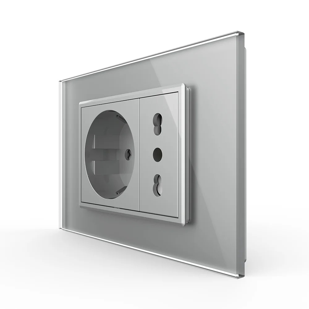 Priza dubla Livolo cu rama din sticla, model italian pentru case, birouri, spatii comerciale, hoteluri. Produse moderne de inalta calitate. Produsul este compatibil cu doze modulare in 3 module cu distanta dintre suruburi de 85 mm.
